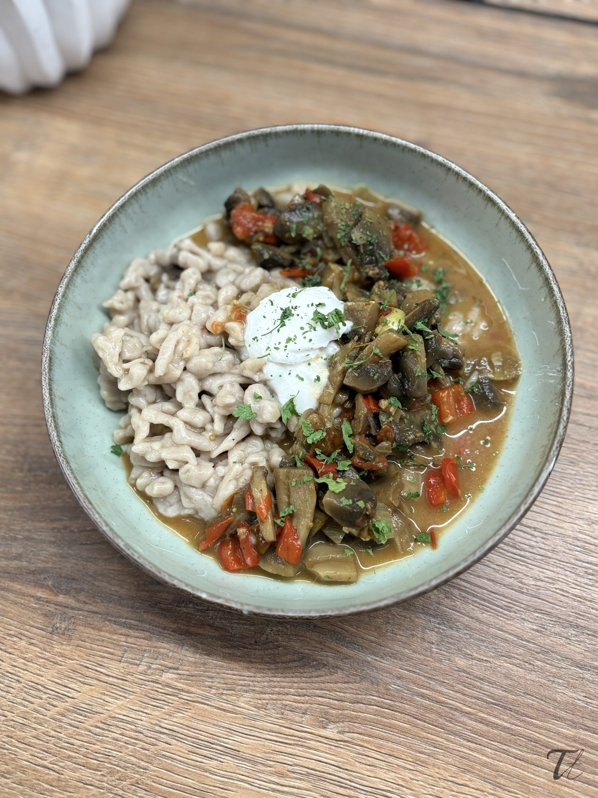 Tálalás:A frissen főtt nokedlit tányérra szedjük, rákanalazzuk a szaftos gombapörköltet, és petrezselyemmel megszórva tálaljuk. Nálom most vegaföl is került rá, mert számomra így teljes az ízélmény. 😊Fogyassz mellé fermentált, savanyított vagy friss zöldségeket, hogy még táplálóbb és pocakbarát eredményt kapj. 🥗