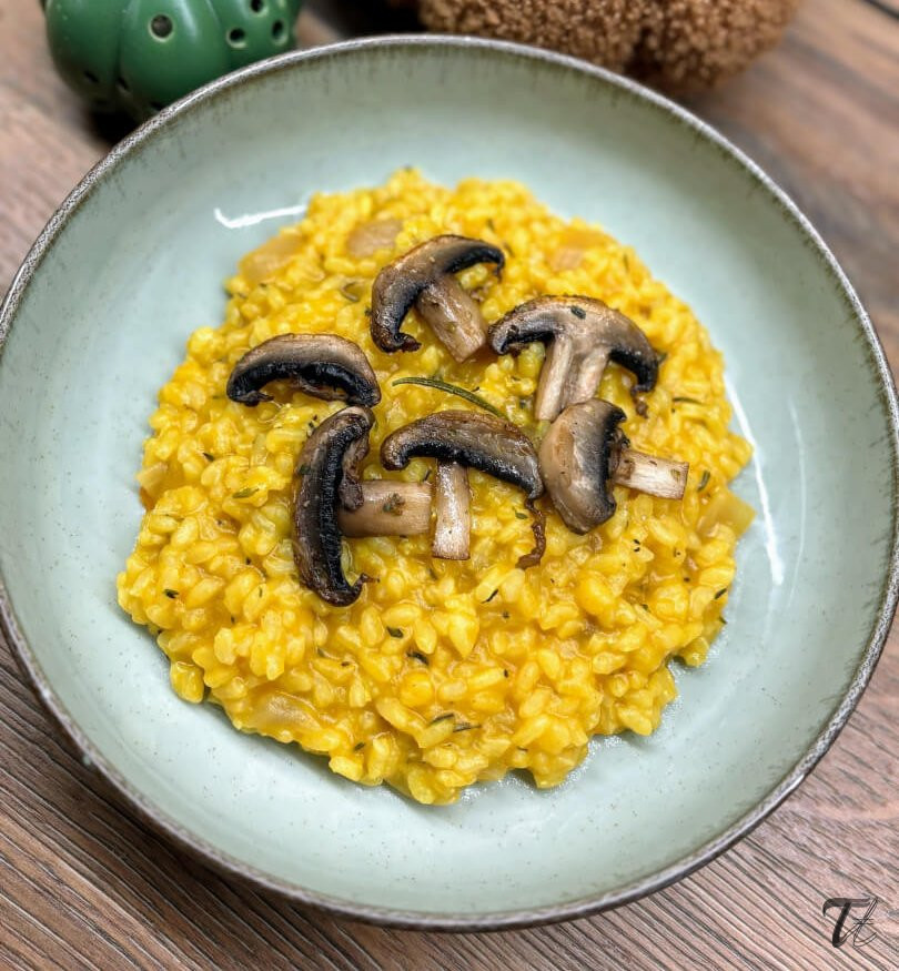 Kanalazd a rizottót tányérba, a tetejére helyezz díszítésként sült gomba szeleteket vagy pirított tökmagot és egy kis kakukkfüvet.