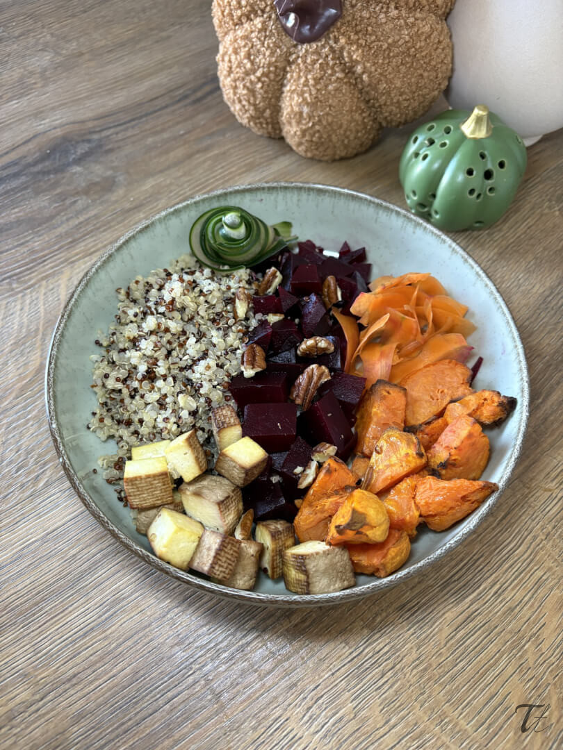 Poke bowl – quinoa, zöldségek és tahinis öntet egy tálban