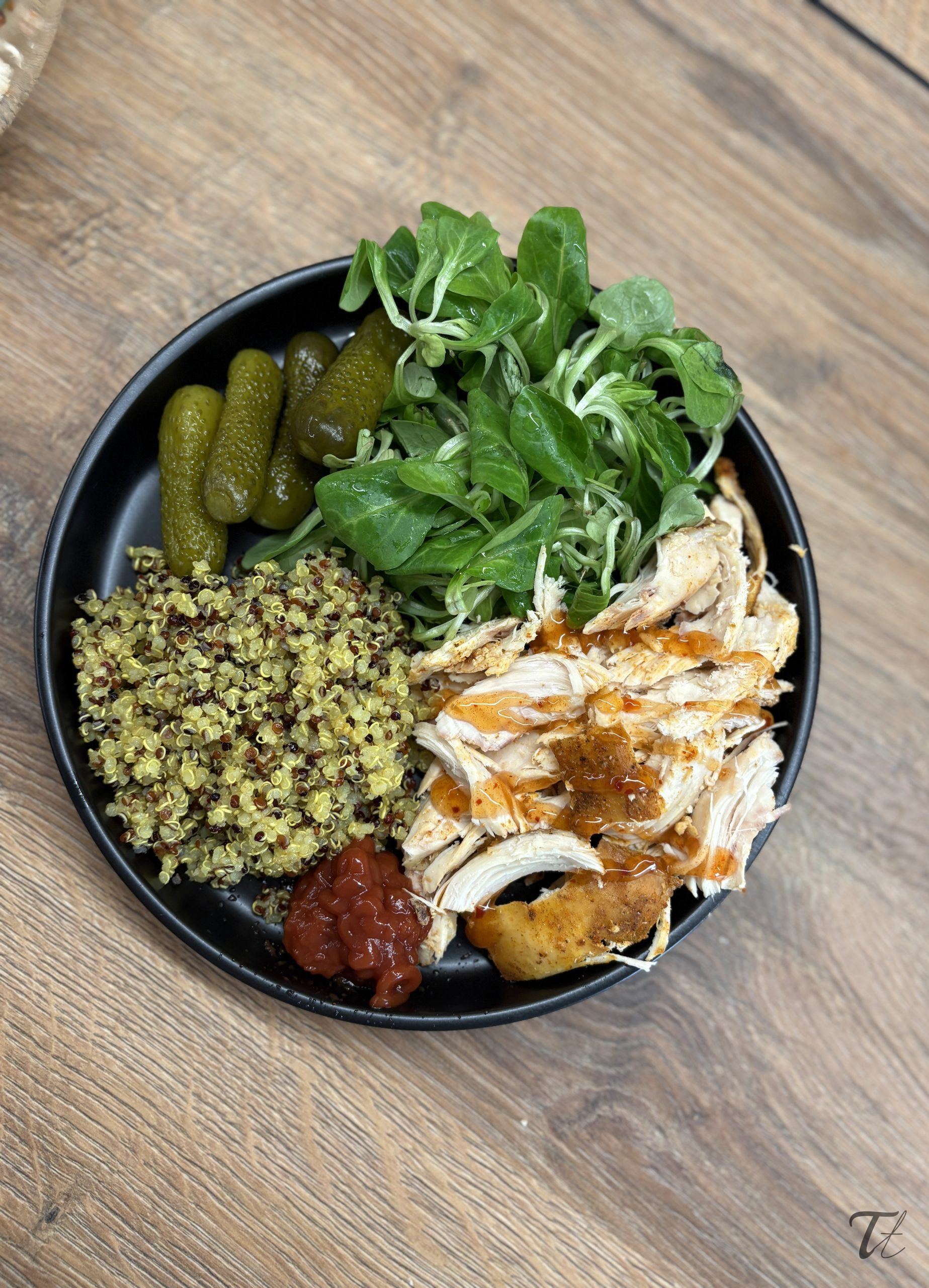Tálalás:Egy tányérra kanalazd rá a főtt quinoát az átmostott madársalátát (erre tehetsz egy kis olivaolajat és pár csepp citormlevet, tedd mellé a csemiubit és a tépett husit. A hús tetejére én sweet chili szószt tettem és mellé még egy kis ketchupot is nyomtam. Merj szárnyalni a saját kreativításoddal és kedvelt ízvilágoddal.💛